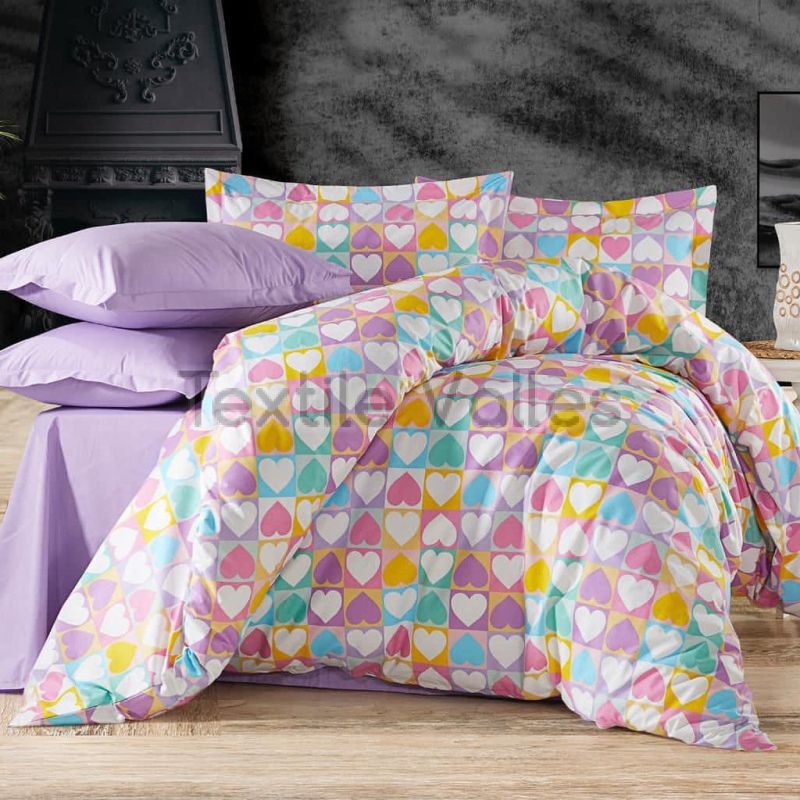 Внесете свежест и настроение в спалнята си с очарователния дизайн на този спален комплект. Разноцветните сърца създават весела и романтична атмосфера, която ще ви зареди с положителна енергия.