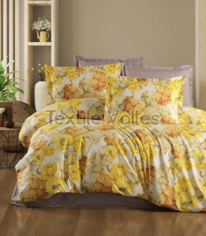 Комплектът е изработен от висококачествени материали, които осигуряват мекота и издръжливост. Флоралният дизайн с жълти и оранжеви нюанси носи свежест и топлина в спалнята, създавайки уютна и релаксираща атмосфера. Цветовете са наситени и дълготрайни, гарантирайки, че комплектът ще запази своя привлекателен вид за дълго време.